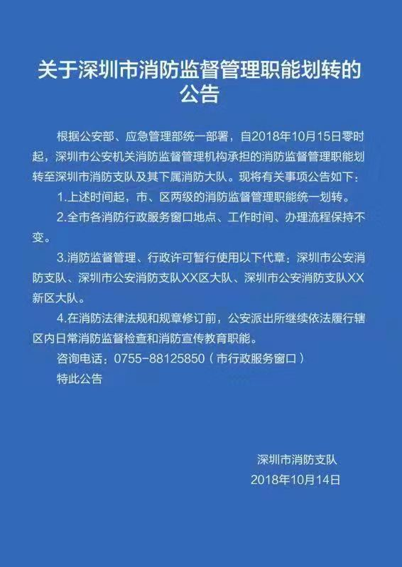 公告称:2018年10月15日零时起,市、区两级的消防监督管理职能统一划转;全市各消防行政服务窗口地点、工作时间、办理流程保持不变;消防监督管理、行政许可暂行使用以下代章:深圳市公安消防支队、深圳市公安消防支队XX区大队、深圳市公安消防支队XX新区大队;在消防法律法规和规章修订前,公安派出所继续依法履行辖区内日常消防监督检查和消防宣传教育职能。